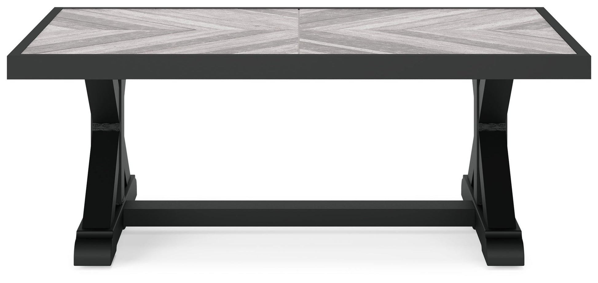 Sporting an easy-on-the-eyes look inspired by driftwood, this coffee table elevates the art of indoor-outdoor living. Beautiful and durable enough for indoor and outdoor use, this high-style/low-maintenance table charms with X-leg farmhouse styling and wows with a thick porcelain table top that’s a natural complement.