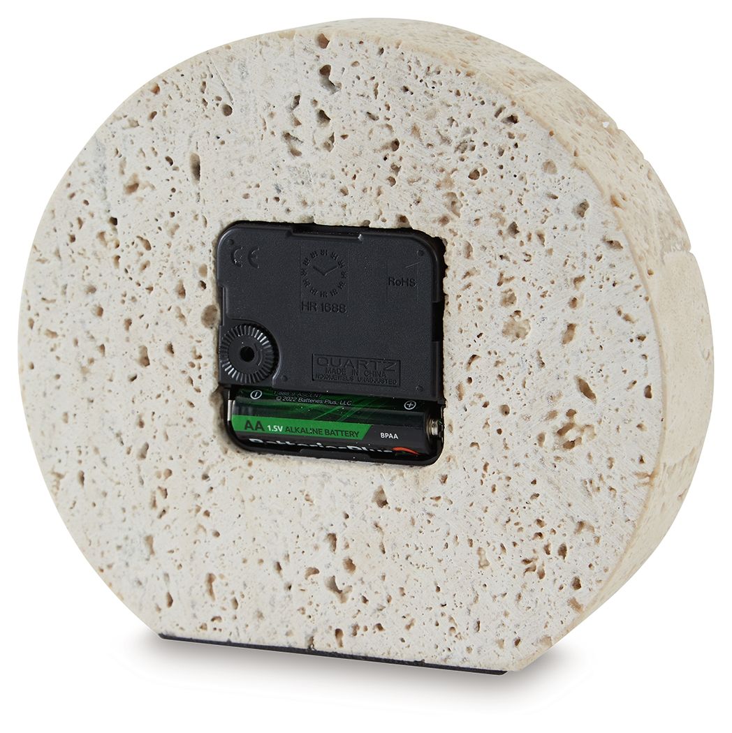 Take note of the time in contemporary style. Crafted from travertine, this clock is sure to lend minimalist flair to shelves and tabletops. Black accents provide a dramatic contrast to the earthy sensibility of the simple-yet-sophisticated timepiece.