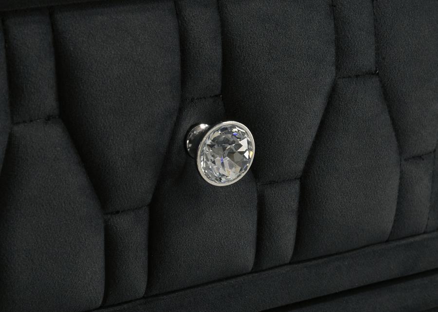 Embrace elegance in full velvet with this five-drawer chest, where ambient lighting meets refined craftsmanship. Upholstered in a stunning velvet, each drawer is adorned with quilted textures, reflective acrylic accents, and crystal knobs for a soft yet glamorous presence. Integrated LED lighting casts a warm glow, while the felt-lined top drawer, English dovetails, tempered glass top, and metal extension glides elevate everyday function. Supported by solid rubberwood legs, this chest blends softness with luminous charm.