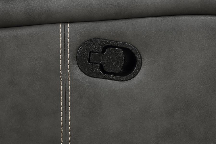 Merging the classic style of both contemporary and transitional design schemes, the sofa set creates a dreamy venue for relaxing. The trending look of smooth leatherette upholstery with vertical topstitching delivers decorative elements and a dimensional impact. This motion-reclining set features foam padding on its frames and pocket coil spring seat cushions, as attached back cushions are capped with ultra-plump headrests. Recline into varying positions using a manual control function, and enjoy space efficiency with its wall-hugger design. Bonus features include a center-mounted loveseat console with a flip-top storage bin and a pair of handy beverage holders.